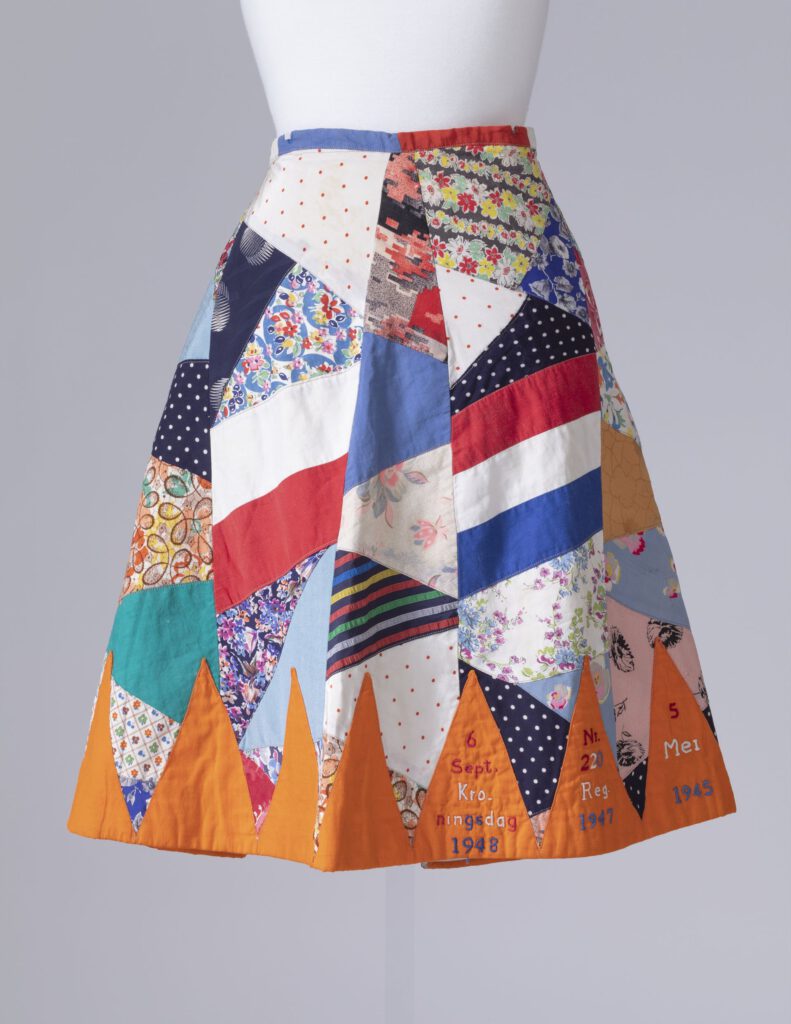Hieronder zie je een afbeelding van een “bevrijdingsrok” Deze rok maakte deel uit van een expositie in het Groninger Museum in 2020. De rok is gemaakt door mevr. Ettina Bos en door haar dochter mevr. Marjanne Boerbei destijds beschikbaar gesteld aan het Groninger Museum.